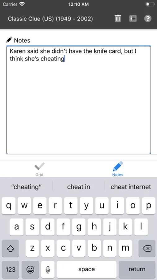 Clue Helper will help your Clue game with quick note taking and automatic hints. It supports over 30 versions of clue, including classics and themed spinoffs.