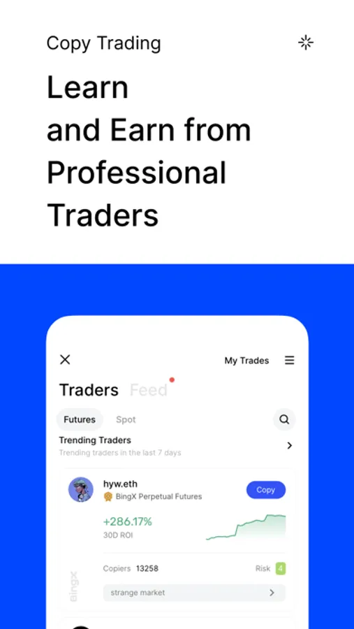BingX offers an extensive array of products, featuring MT5, TradingView, GameFi, DeFi, BRC20 and other Web3 products. The copy trading feature enables users to leverage the strategies of successful traders, enhancing their trading experience.