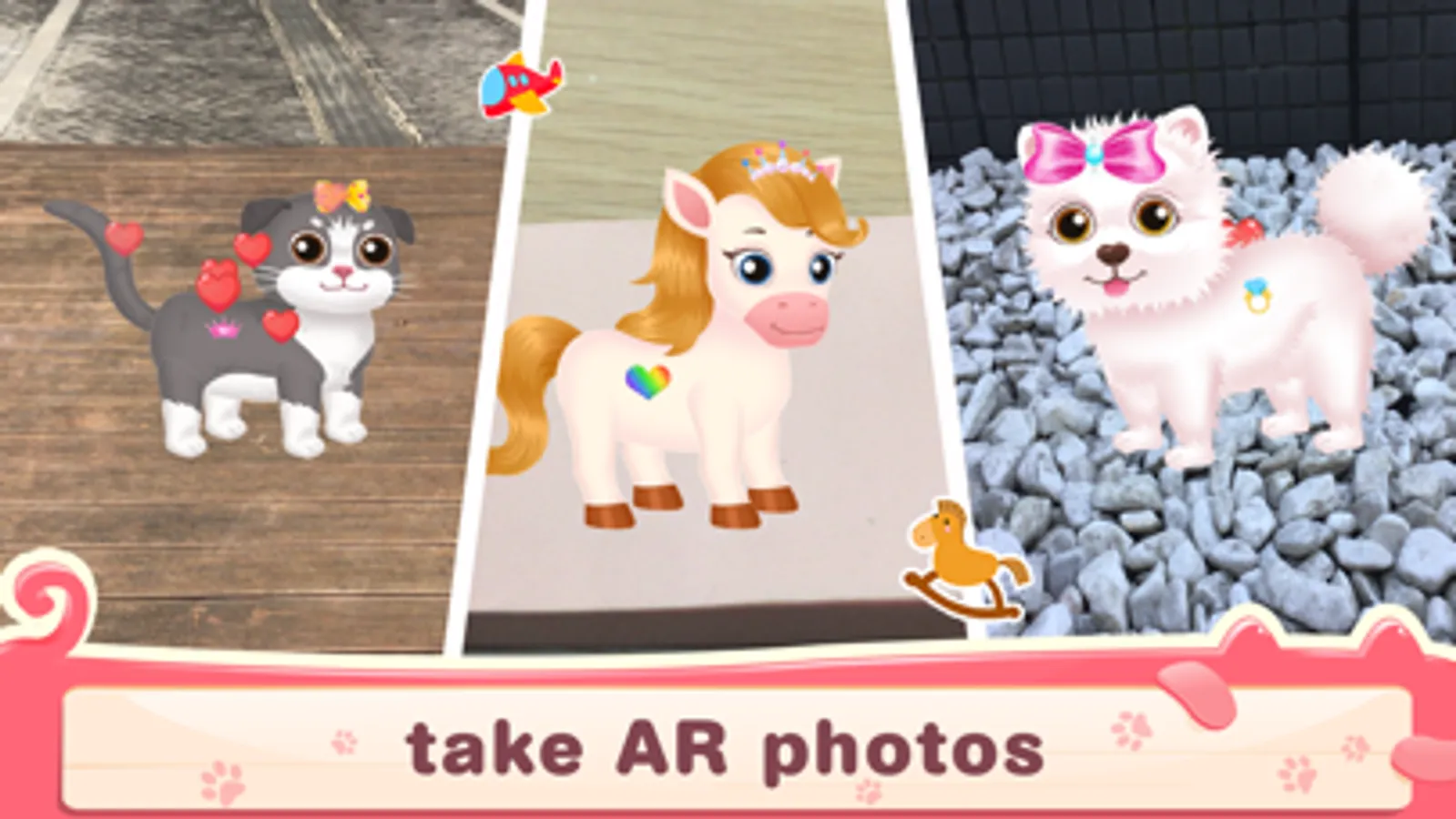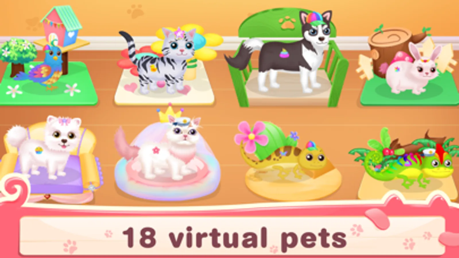 18 adorable pets for kids to take care of, feed, play with, pet them when they need love. - kitties, puppies, hamster, pig, pony, rabbit, parrot, turtle, chameleon, and lizard.