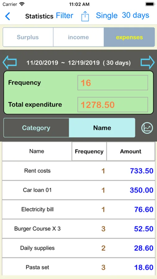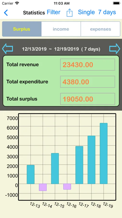 - Financial statistics : Surplus, Revenue, Expenditure statistics,Optional 7,15,30,90 day statistics and draw a graph. Left and right button can switch the previous or the next number days.