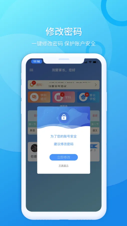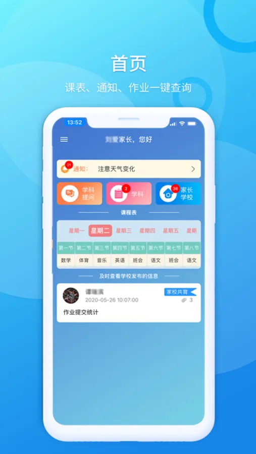 本应用主要用于家长查看学校发布的信息,包括微信公众号内容、班级学校通知、学科作业、每周课程表、每日任务等。