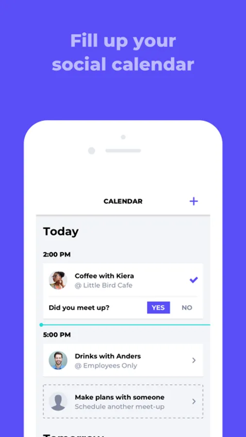 • Skip the back-and-forth and indecision! Pick a friend, choose an activity, and tell us when you’re available. We’ll help you choose a great location to meet, and then your invitation is sent!