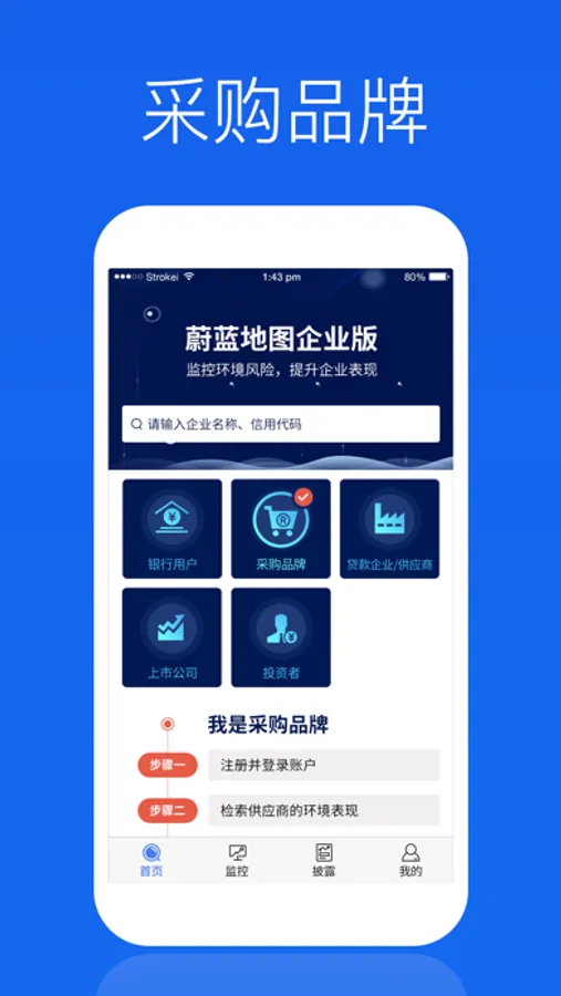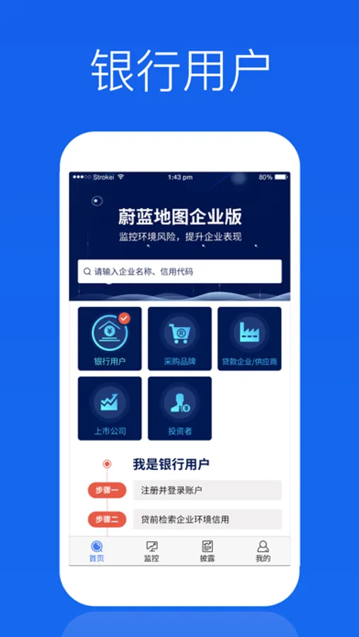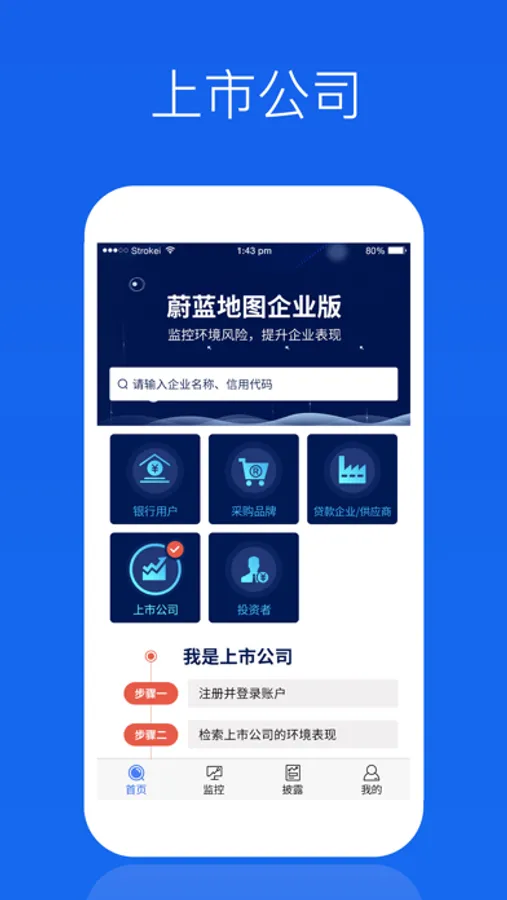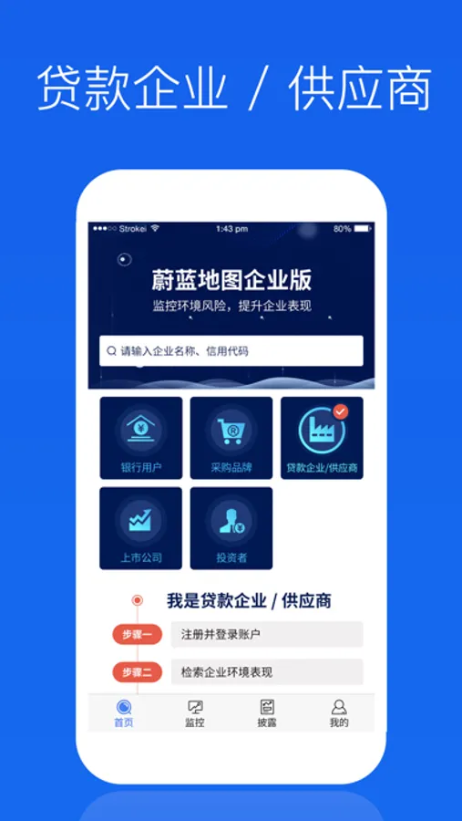 蔚蓝企业版是针对B端用户提供的行业应用解决方案,可以让用户通过选择相应的角色进行企业查询,查看企业详细信息,针对企业监管记录进行信息披露等功能,在个人中心可以进行信息的基本设置。