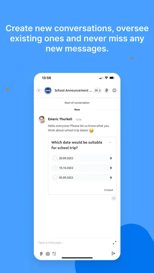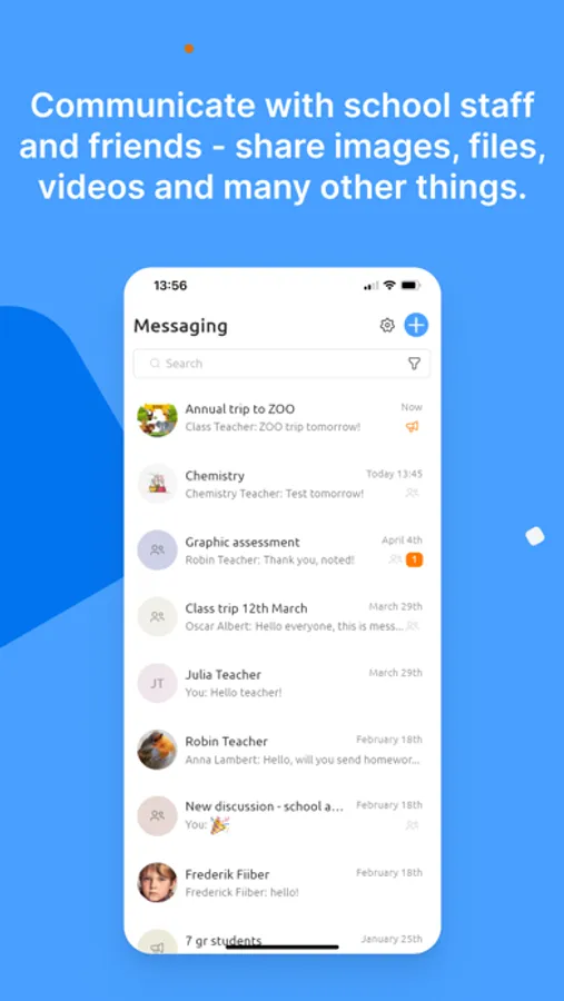 Leave email school groups behind and manage all school related conversations in eKool Messaging app. Messaging app for eKool system users provide ability to communicate with eKool users, share files, videos, images and many other things. Create new conversations, oversee existing ones and never miss any new messages. Try out eKool Messaging app!