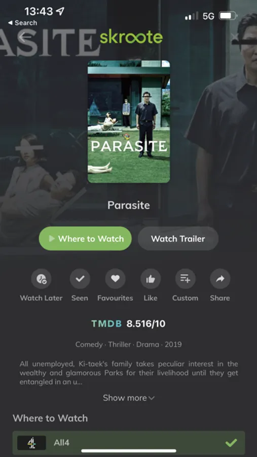 Skroote instantly searches all of the major streaming platforms including Netflix, Amazon Prime Video, Disney+, Apple TV+, BBC iPlayer, All4, ITV and many more.
