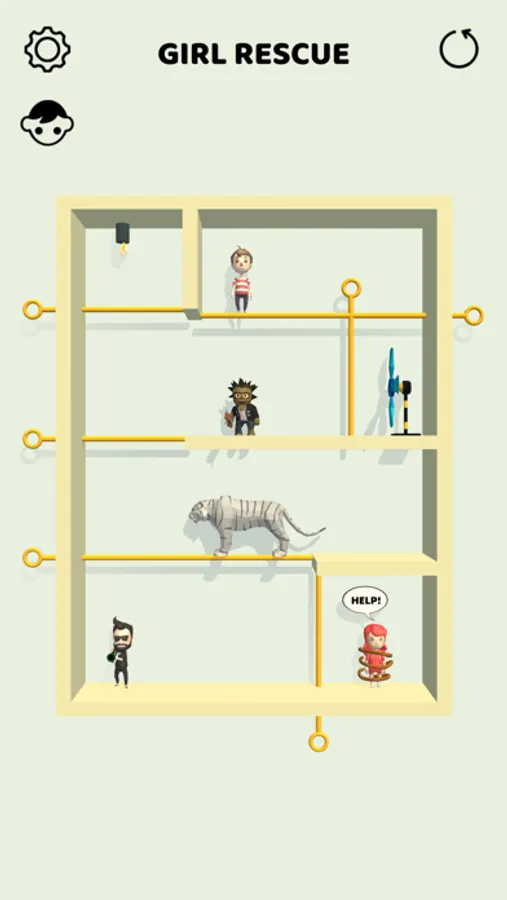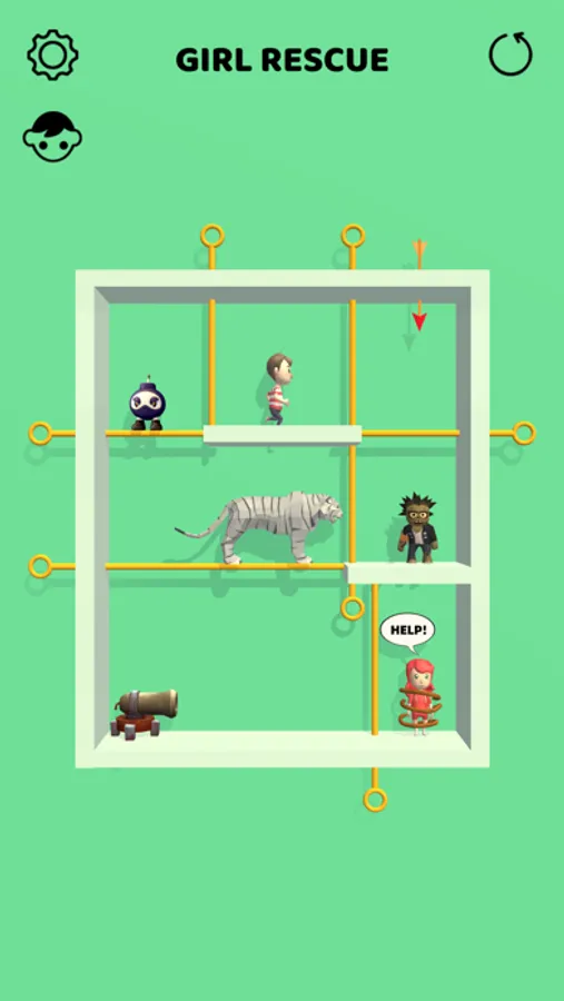 As an expert with super intelligence, your goal is to try various commands and methods to pull the pin according to the plot set by the game, to avoid bombs, ferocious animals, zombies,arrow... and finally help the boy to escape out of the dangerous room. Unlike rope rescue, pin rescue focuses more on strategic adventures.