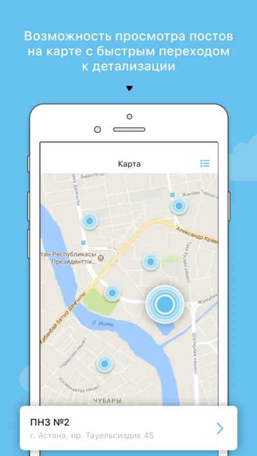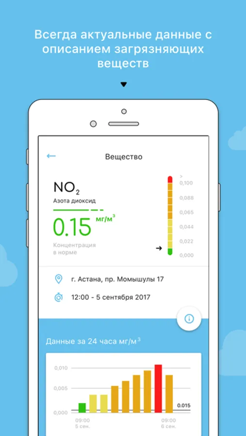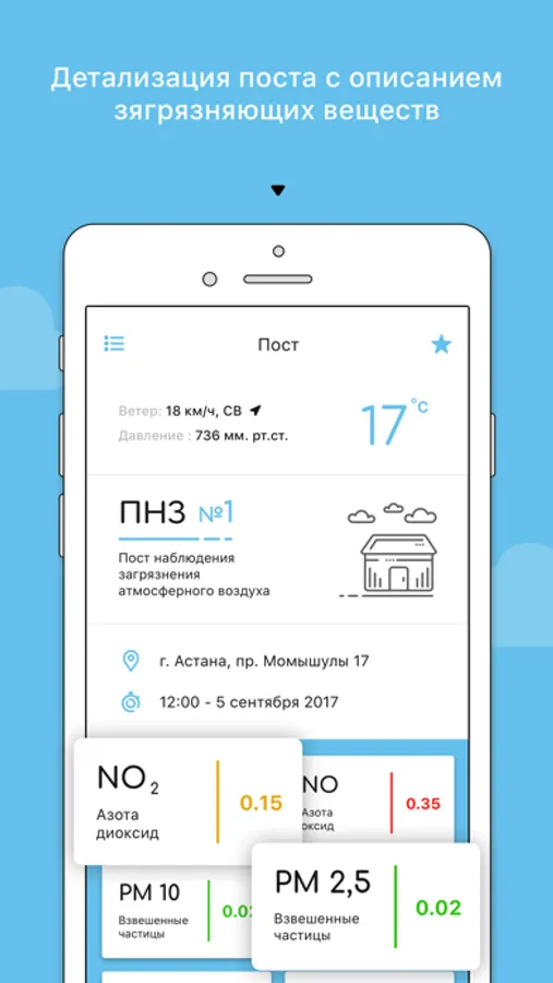Приложение позволяет отслеживать качество атмосферного воздуха на всей территории Казахстана.