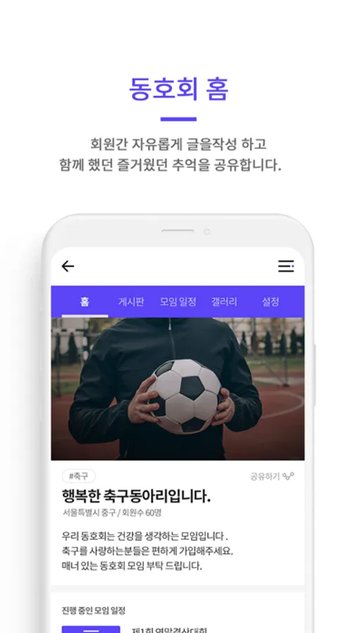동호회 모임일정 관리, 회원초대, 채팅, 갤러리 등 다양한 동호회 맞춤 기능을 사용하세요~!
