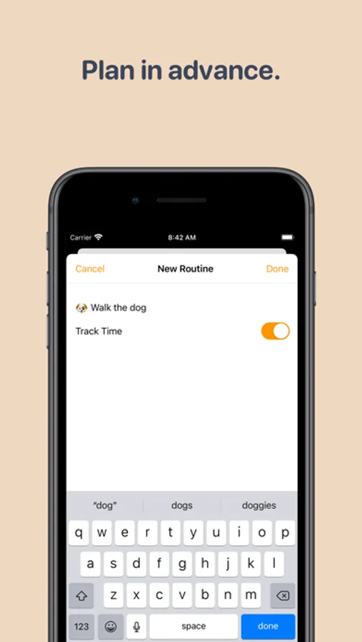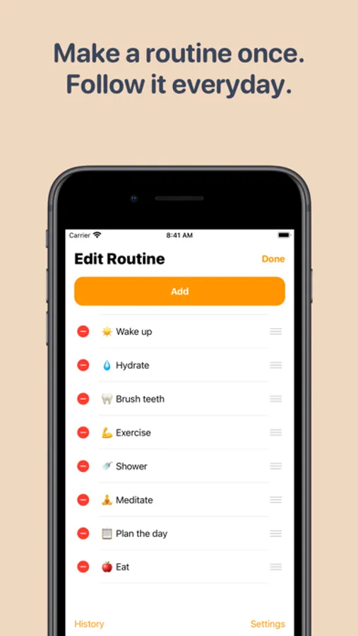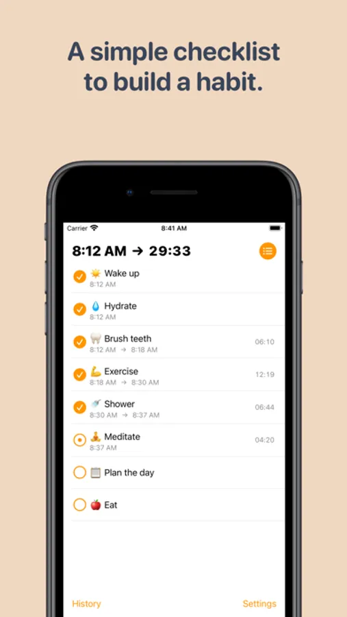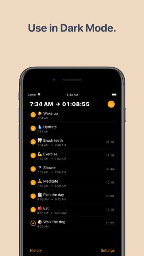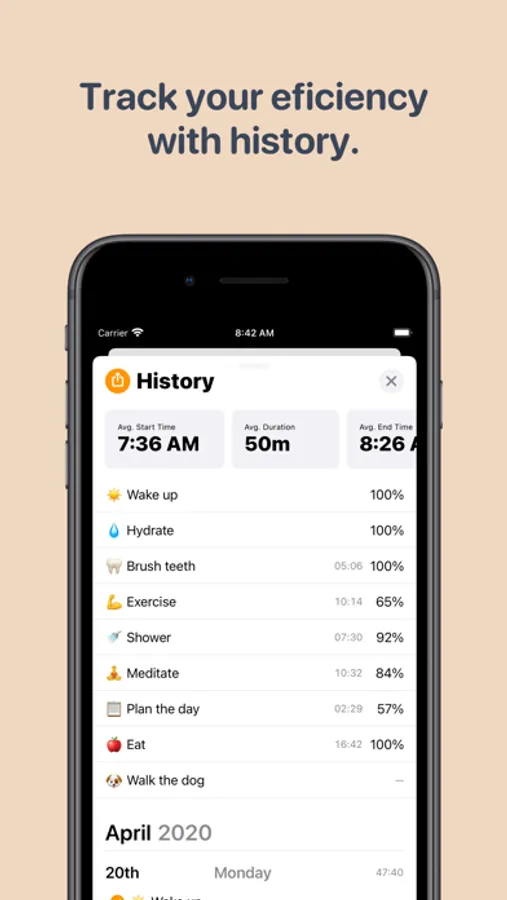 Get insights on your routine by tracking the time each task takes. When the day is over your progress is saved to history where you can see how your effectiveness changes over time.