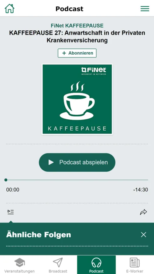 Mit der FiNet App haben Sie die Dienste und Services der FiNet-Gruppe stets zur Hand: Veranstaltungen direkt buchen, unseren Podcast "KAFFEEPAUSE" entspannt in der App aufrufen, das E-Paper FiNet E-Worker lesen und mit der Broadcast-Funktion verpassen Sie niemals unsere wichtigsten News.