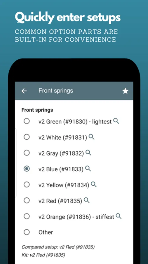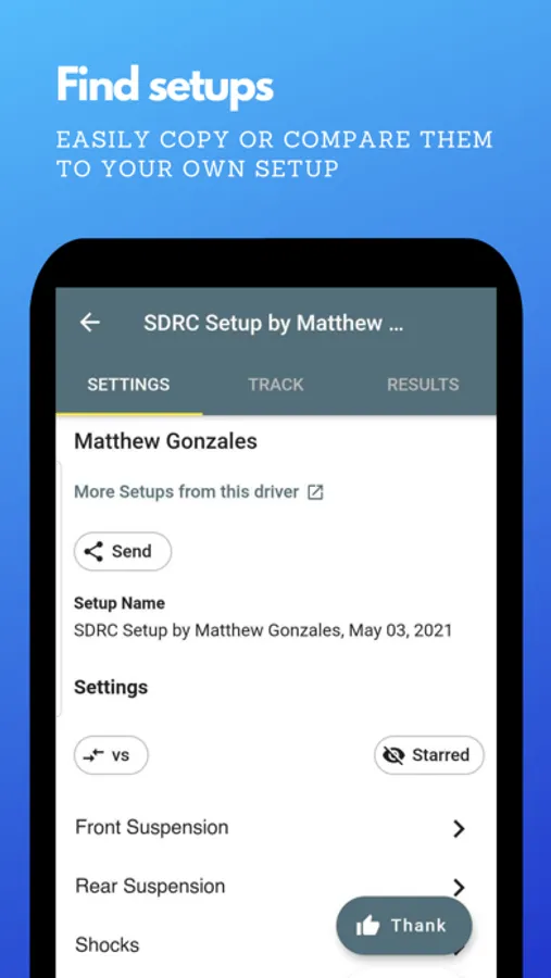 Check out other people’s setups directly in the app (or at www.sodialed.com), and easily compare them to your own setup to get a quick view of what’s different - no need to sift through PDFs. Thank other racers for sharing, and see the most popular shared setups.
