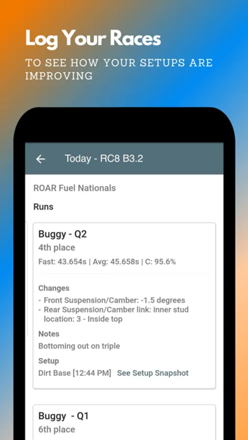Setup changes are even easier to track now - just change your settings, record your race, and we’ll create a race log so you can see your changes and the results of those changes at a glance without having to create new setup sheets.