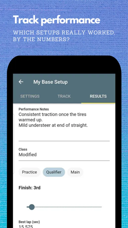 - Race log: easily record your setup changes and test/race results, so they’re always handy on your phone