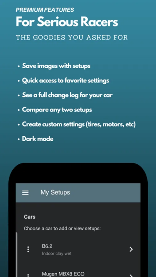Save your settings for suspension, shocks, drivetrain, tires, differentials, weights, body, motors/engines, electronics, and hop-up parts with just a few taps.