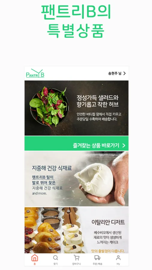 팬트리B 팀은 최고의 상품을 좋은 가격에 공급하기 위해 국내외 산지를 직접 발로 뜁니다. 지중해연안의 다채로운 건강 식자재, 자갈치의 신선한 해산물, 동남아 산지에서 까다롭게 고른 새우, 당사의 첨단 식물공장에서 깨끗하게 재배하여 포장한 샐러드와 허브, 좋은 재료의 맛이 풍부하게 느껴지는 프리미엄 이탈리언 디저트에 이르기까지 산지의 생생함을 고객께 전합니다.
