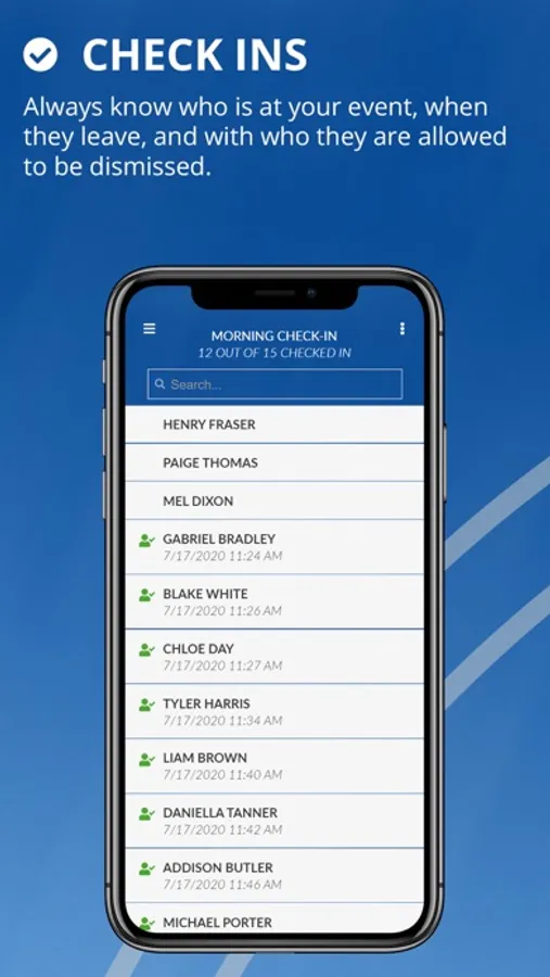 CHECK INS: Always know who is at your event, when they leave, and with who they are allowed to be dismissed.