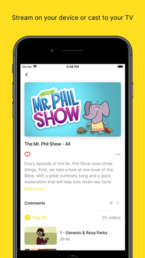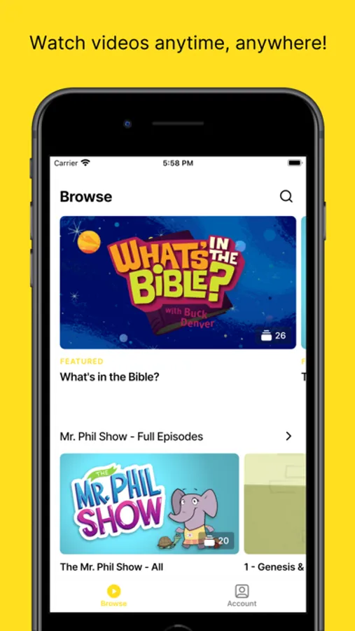 From award-winning filmmaker and kids Bible teacher Phil Vischer comes Mr. Phil TV, an on-the-go library of videos, stories, and songs that will bring the Bible to life for your kids, wherever they are. Includes all the content from Phil’s acclaimed "What’s in the Bible?" series plus "The Mr. Phil Show", "Emily’s House", "Bible Nuts", and more. Phil’s programs and shorts are famously fun and funny, but equally highly-regarded for solid biblical teaching.