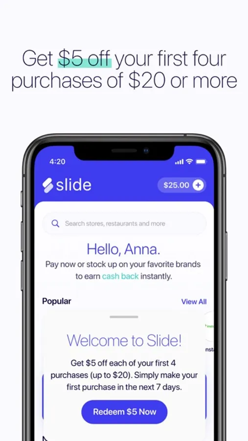 Slide is the fastest way to earn cash back as you shop — in store or online. Get up to 10% cash back instantly at hundreds of retailers and restaurants when you pay with Slide.