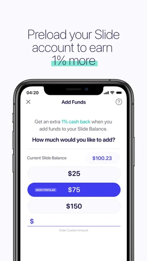 - Add funds to your Slide Balance in advance for an extra 1% cash back