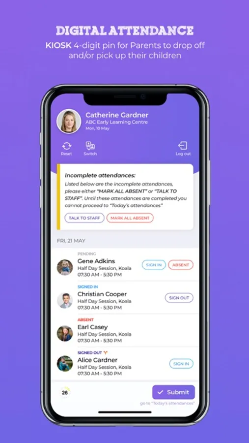 Our app allows your staff and parents to sign in using our Kiosk system which will help you automate your sign in and sign out process.