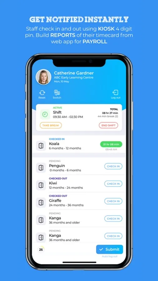 • Staff can check in to the centre and rooms and record break times.
