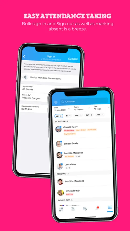 • Educators can check in children in bulk, record drop-off and pick-up