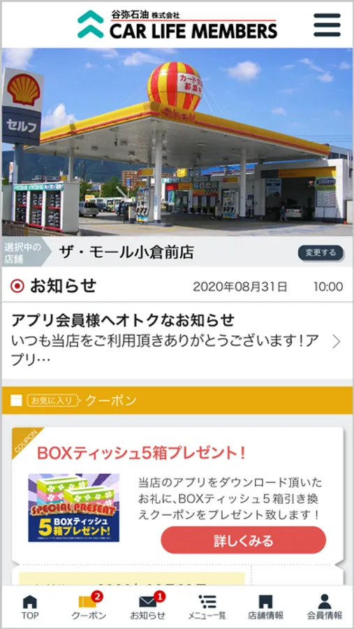 当社のアプリ「谷弥石油カーライフ・メンバーズ」ではアプリで簡単に洗車・コーティングなどのご予約や愛車のメンテナンス管理が可能の他、ご登録いただいた店舗で利用いただけるお得なクーポンや各種メニューの割引情報を配信しております。
