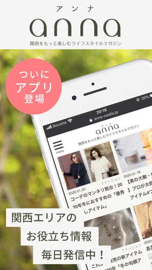 グルメやおでかけ、イベントなど関西のお役立ち情報のほか、ファッションやビューティー、ヨガなどさまざまなジャンルを気軽にいつでも読める「anna(アンナ)」の公式アプリ。