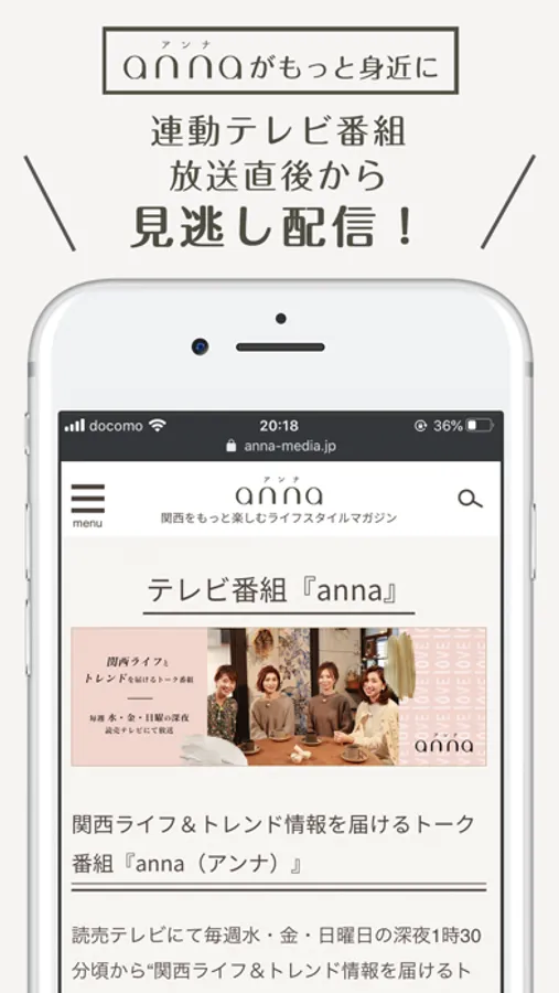 *さらにannaアンバサダーが出演するオリジナルのウェブ連動テレビ番組「anna」も読売テレビで週3回絶賛放送中(関西ローカル)。