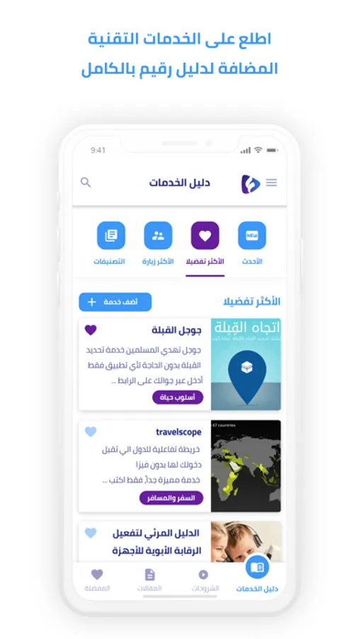 كما يوفر لك التطبيق مفضلة خاصة بك؛ تستطيع عبرها حفظ أي محتوى للرجوع إليه في أي فترة لاحقة، كذلك تستطيع مشاركة المحتوى مع من تريد عبر أي شبكة اجتماعية بسهولة.