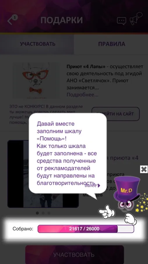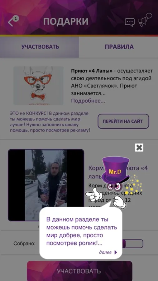 Работает по тому же принципу что и конкурсы, чтоб помочь, например, собачьему приюту, достаточно посмотреть рекламный ролик, а все вырученные средства от рекламы в данном разделе идут на конкретное Доброе дело.