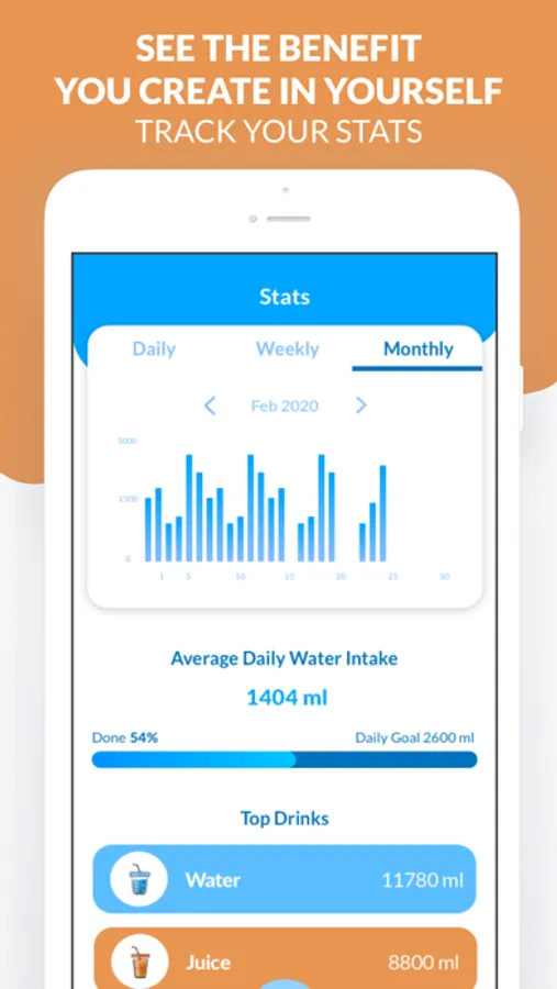 The app tracks your daily beverage consumptions and creates insights and weekly reports for you to evaluate your health. Insights demonstrate which beverages you're drinking most and how much you consume each beverage day by day.