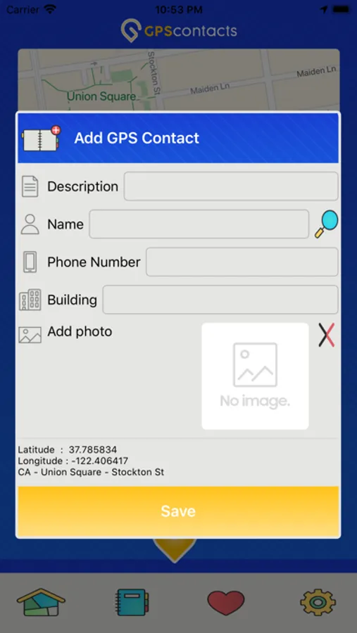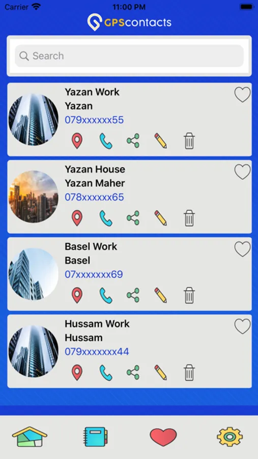 GPS contacts is a true addressing book which includes GPS location, description , name , phone number, location image and building code number within only one App. If you are looking to save your own GPS with all the above mentioned information and specific personalised details, then you are absolutely in need to install our remarkable GPS Contact APP.