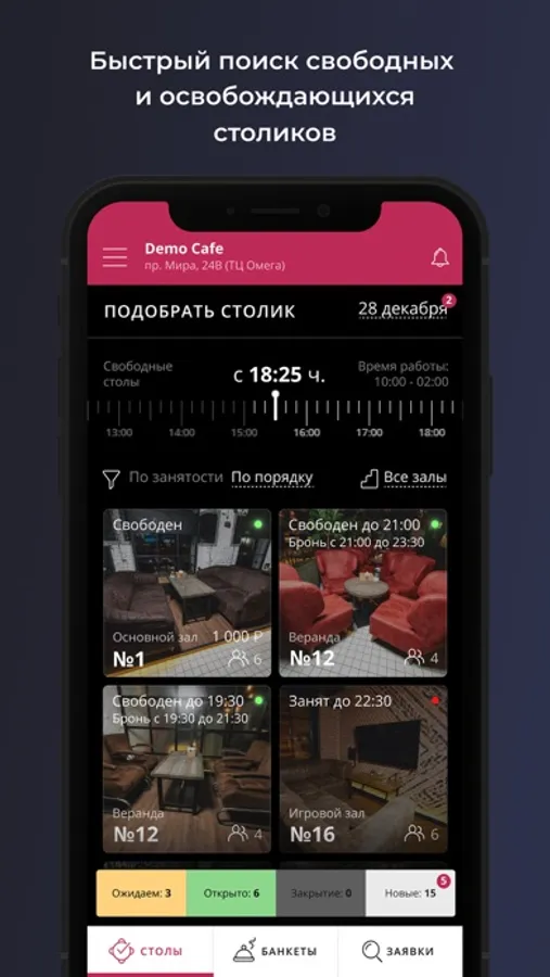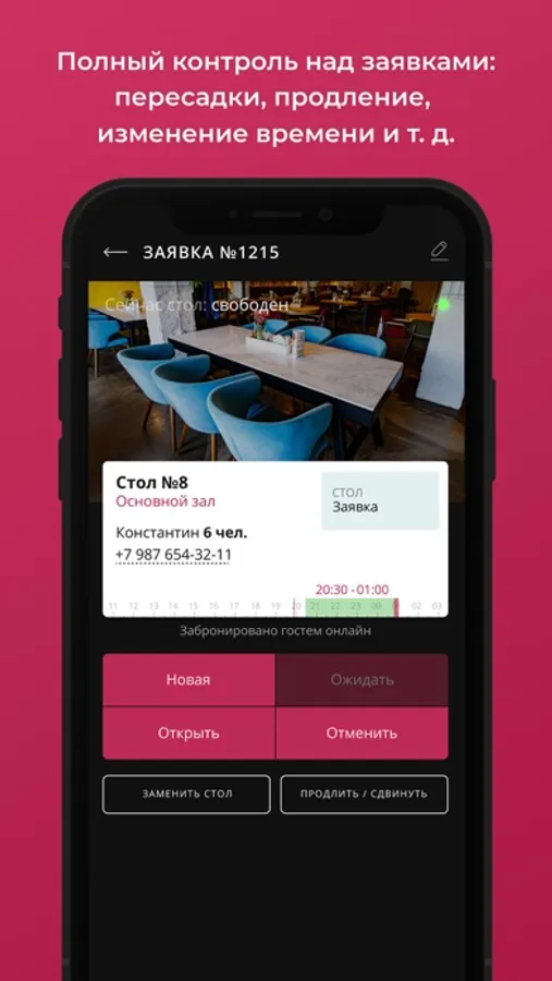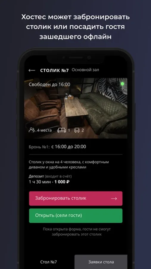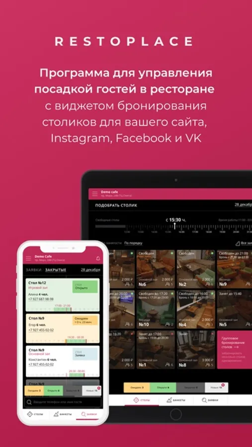 Виджет бронирования устанавливается на вашем сайте, в вашем Instagram, Facebook и группе Вконтакте. Гости, не выходя из социальной сети, смогут выбрать и забронировать свободный столик. Хостес сразу же увидит новую заявку
