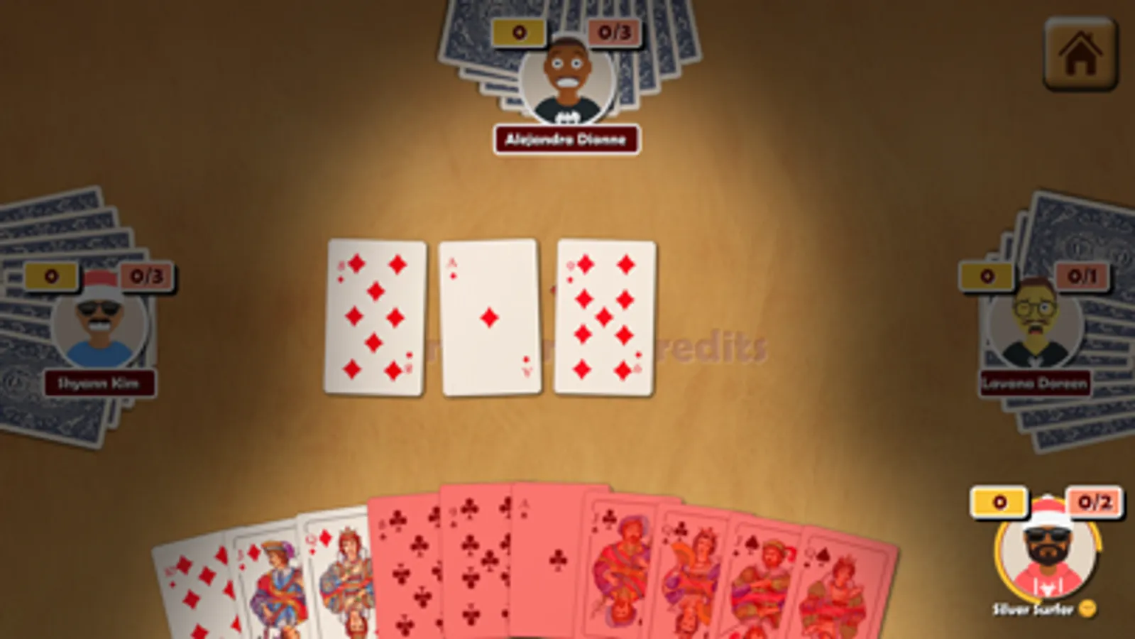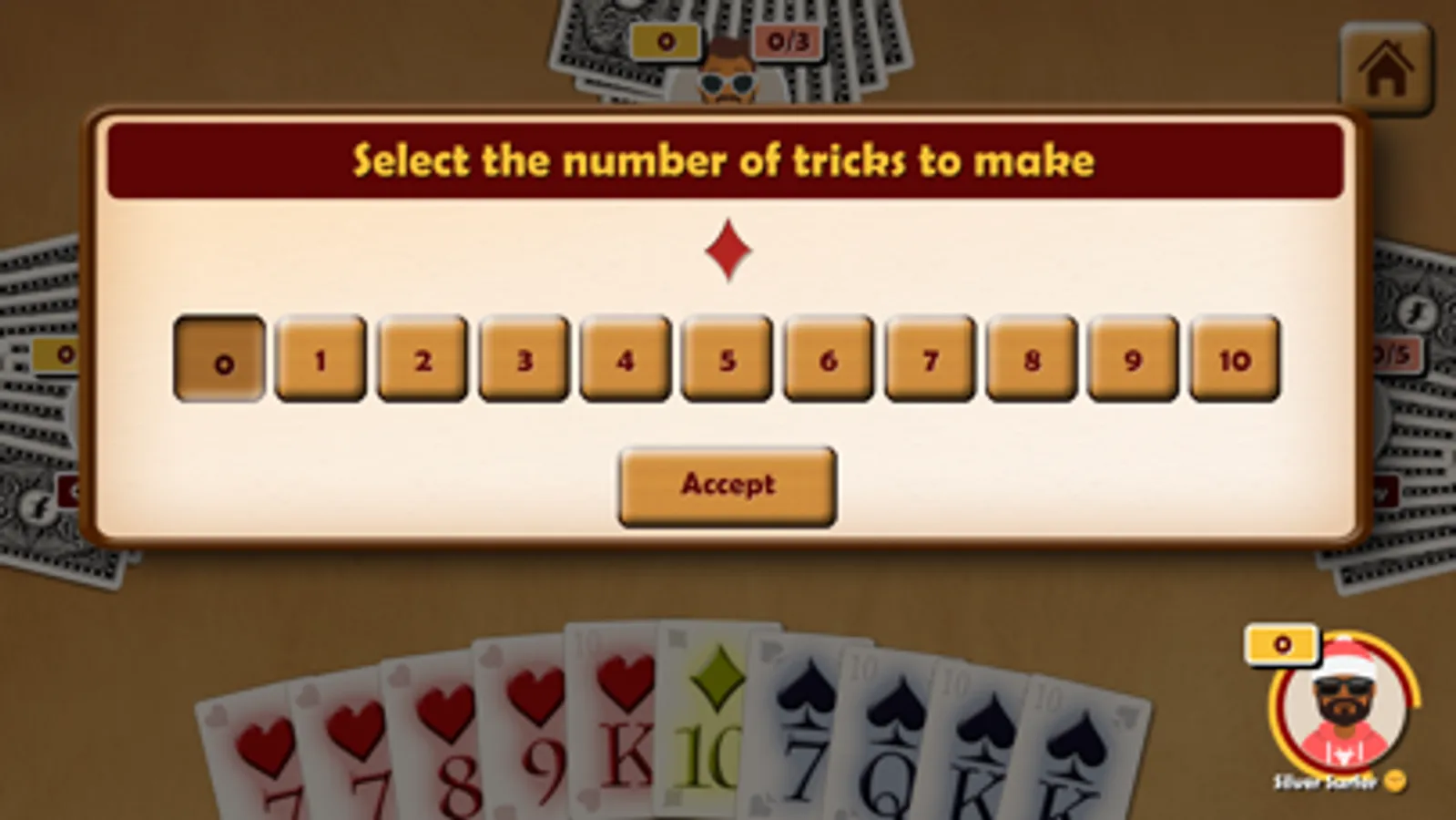 The object is for each player to bid the number of tricks he thinks he can take from each hand, then to take exactly that many; no more and no fewer. Initial bids are made sequentially and in each new round the next player in line starts to bid first. After a round is finished the next round will start with one card less. The last round starts once each player has only one card