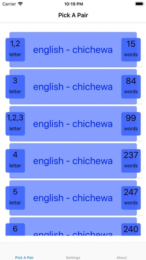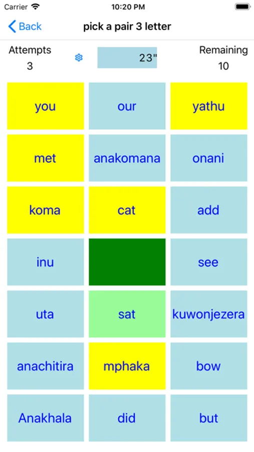 A tiny pick a pair app that helps you along, with learning the basics of Chichewa. Containing 1, 2, 3, and 4 (free), 5, 6, 7, 8 and 9 letter (paid for) English words translated to Chichewa for you to play at pick a pair. Test your self on the go!