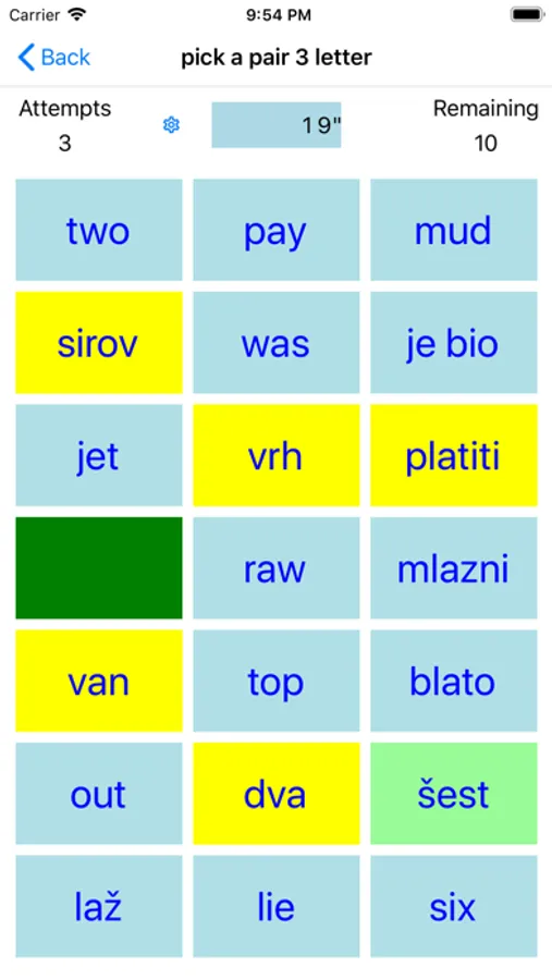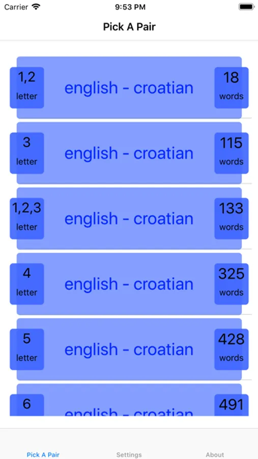 A tiny pick a pair app that helps you along, with learning the basics of Croatian. Containing 1, 2, 3, and 4 (free), 5, 6, 7, 8 and 9 letter (paid for) English words translated to Croatian for you to play at pick a pair. Test your self on the go!