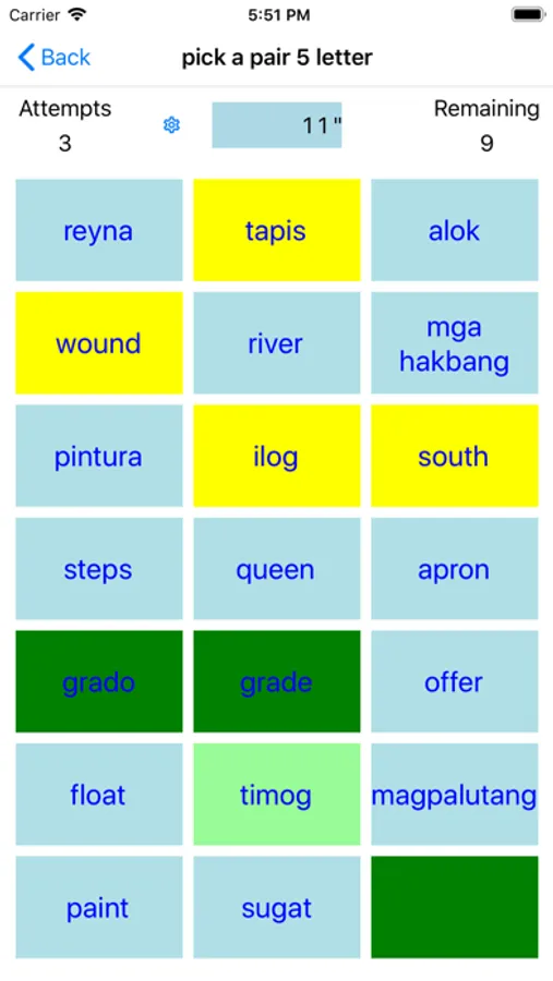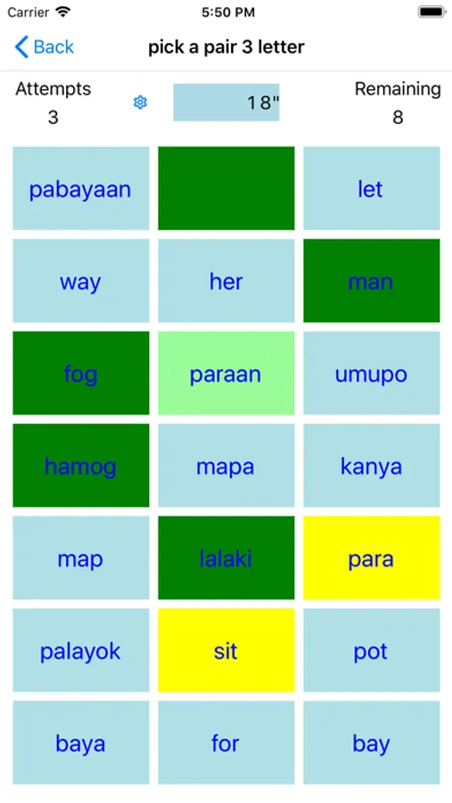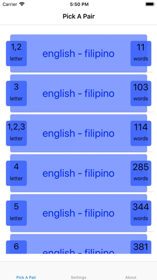 A tiny pick a pair app that helps you along, with learning the basics of Filipino. Containing 1, 2, 3, and 4 (free), 5, 6, 7, 8 and 9 letter (paid for) English words translated to Filipino for you to play at pick a pair. Test your self on the go!