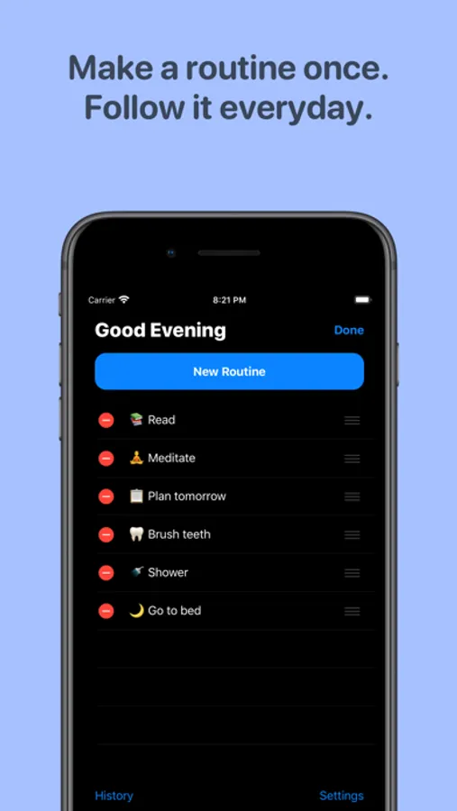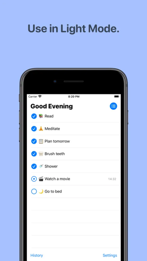 Reach towards your perfect morning by marking tasks done one-by-one. It‘s such a pleasure to see the checkmarks appear. The checklist progress is archived every day, letting you to build the habit a day at a time.