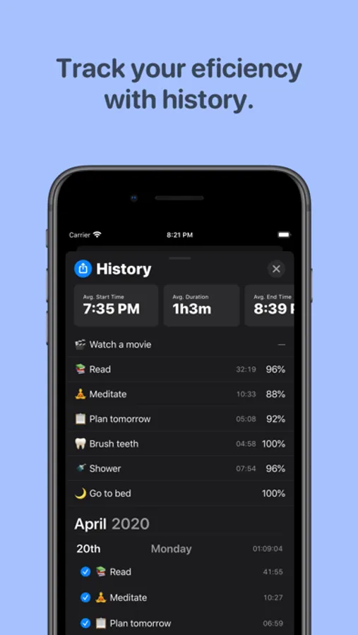 Get insights on your routine by tracking the time each task takes. When the day is over your progress is saved to history where you can see how your effectiveness changes over time.