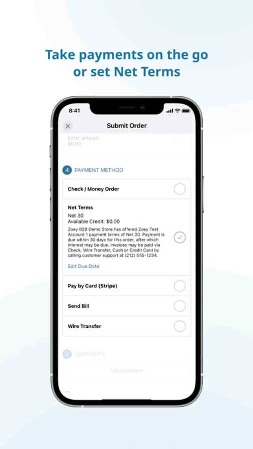 Zoey’s eCommerce mobile app uses "stripe" to instantly accept payments on-site instead of waiting for invoice payments. Payments can also be made using saved credit cards assigned to specific customers' accounts.