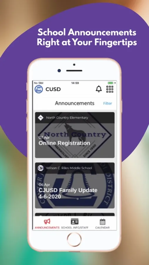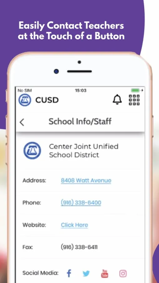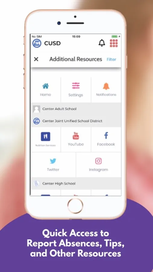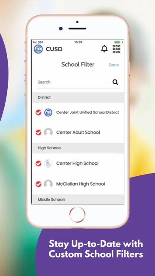 The app includes information for the district and all schools. Filter by the school your child attends to feature information for that school.