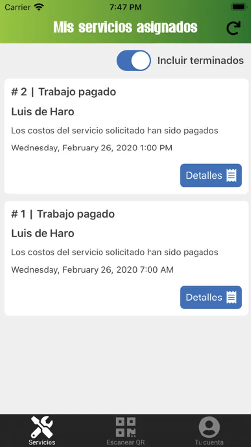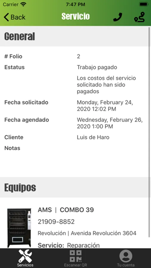 - Visualizar el detalle completo de un servicio (fecha, hora, lugar, cliente, equipos, qué se solicitó)