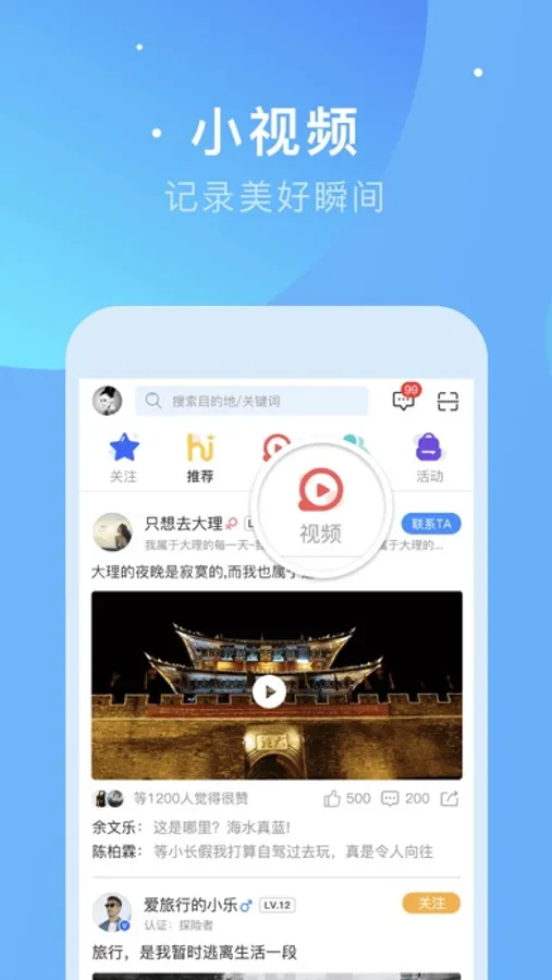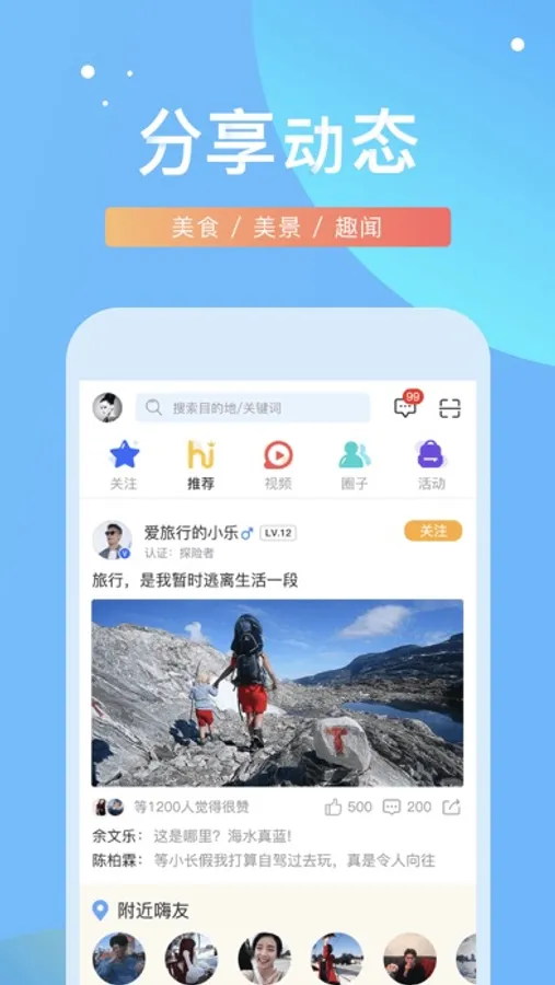 一款旅行资讯、社交APP,提供各种旅行活动、周边游、旅游线路,生活、旅行动态分享,欣赏美景趣闻、发现更多美食,商家入驻,交友互动,体验生活新姿态。