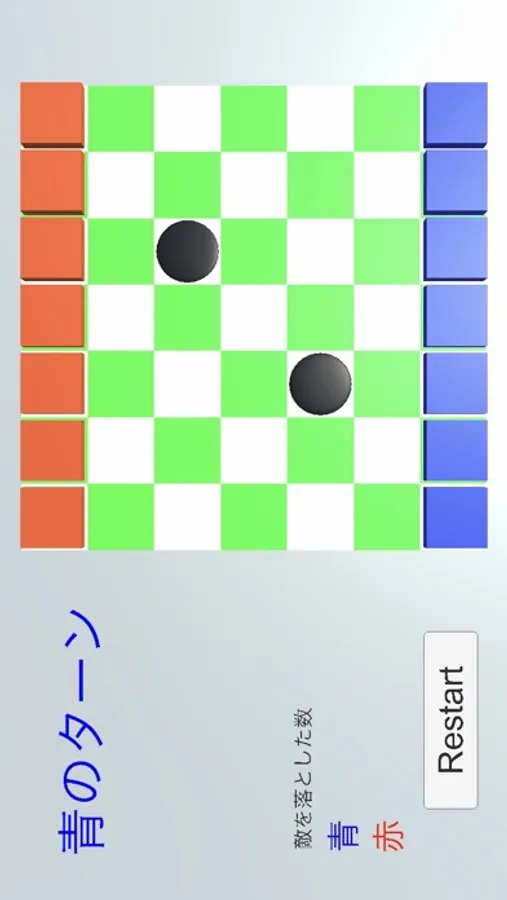交互に赤と青の駒を押し合って穴や盤外に押し出すゲームです。