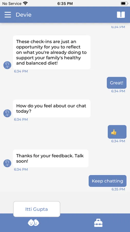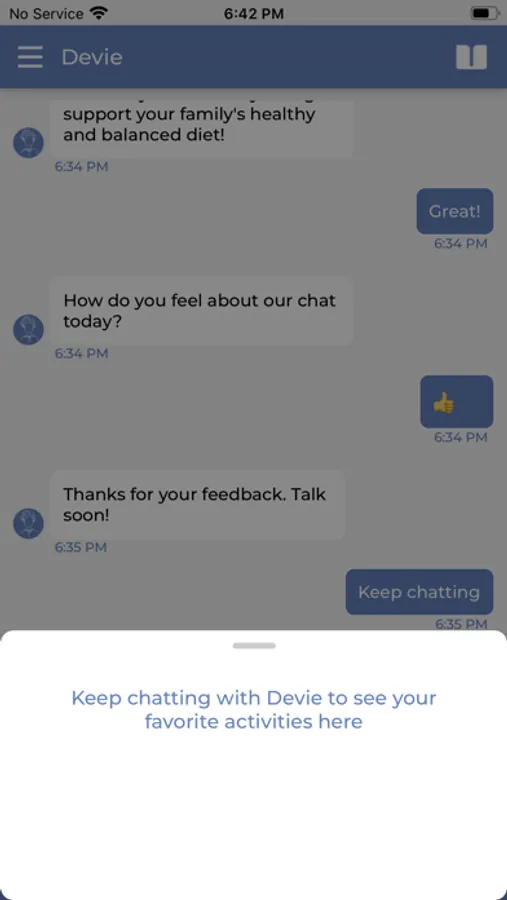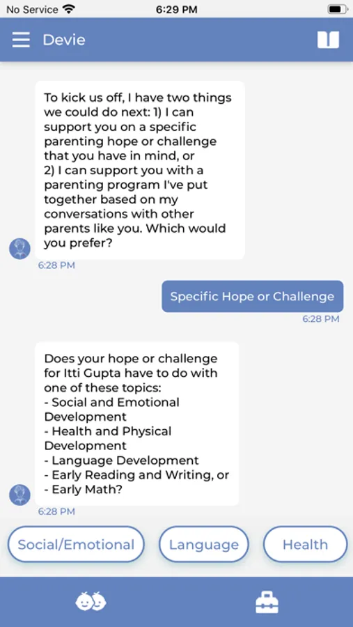 Devie does this by checking in every day for a two to five minute chat. Each of these chats use content from the Peep Learning Together Programme, a parenting support program that has been proven effective at improving parent and child outcomes by randomized control trial.