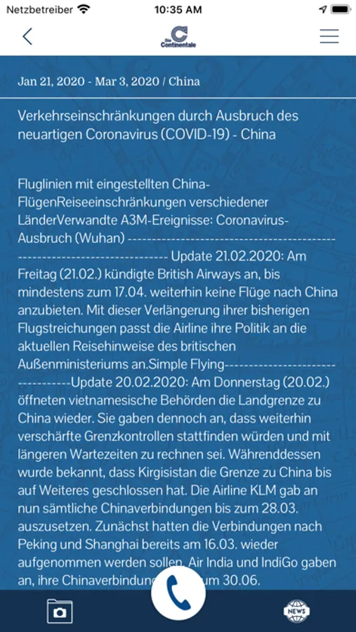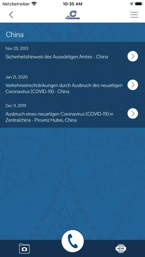 The Continentale emergency app helps whenever you need help. The app has an emergency call feature that connects you directly to a medical service center in case of an emergency. At the same time, your geolocation data is forwarded to the ServiceCenter and the medical staff and doctors as well as security experts can specifically initiate the necessary support. Furthermore you can use 24/7 our medical videoconsultation. You will also receive useful country information and alerts.