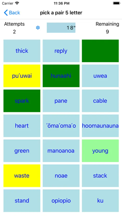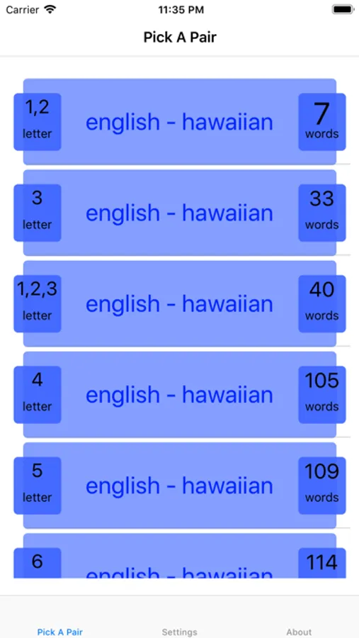 A tiny pick a pair app that helps you along, with learning the basics of Hawaiian. Containing 1, 2, 3, and 4 (free), 5, 6, 7, 8 and 9 letter (paid for) English words translated to Hawaiian for you to play at pick a pair. Test your self on the go!