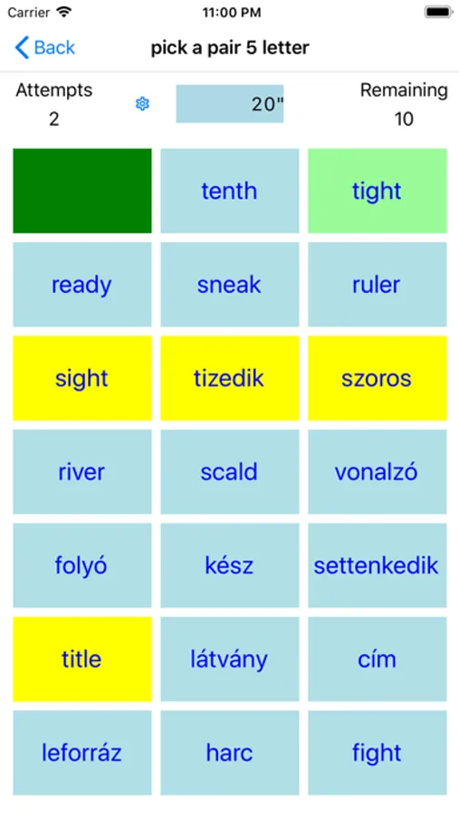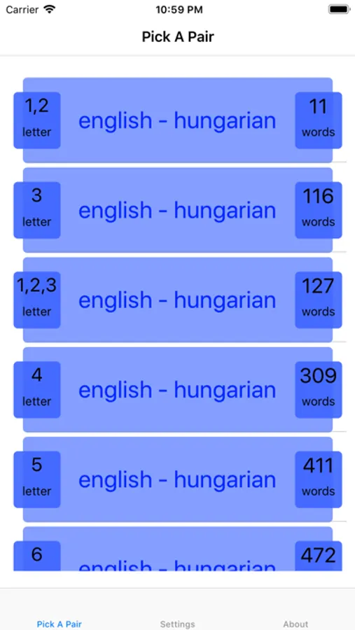 A tiny pick a pair app that helps you along, with learning the basics of Hungarian. Containing 1, 2, 3, and 4 (free), 5, 6, 7, 8 and 9 letter (paid for) English words translated to Hungarian for you to play at pick a pair. Test your self on the go!