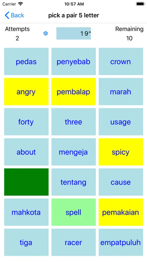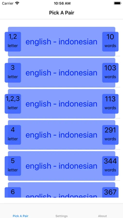 A tiny pick a pair app that helps you along, with learning the basics of Indonesian. Containing 1, 2, 3, and 4 (free), 5, 6, 7, 8 and 9 letter (paid for) English words translated to Indonesian for you to play at pick a pair. Test your self on the go!